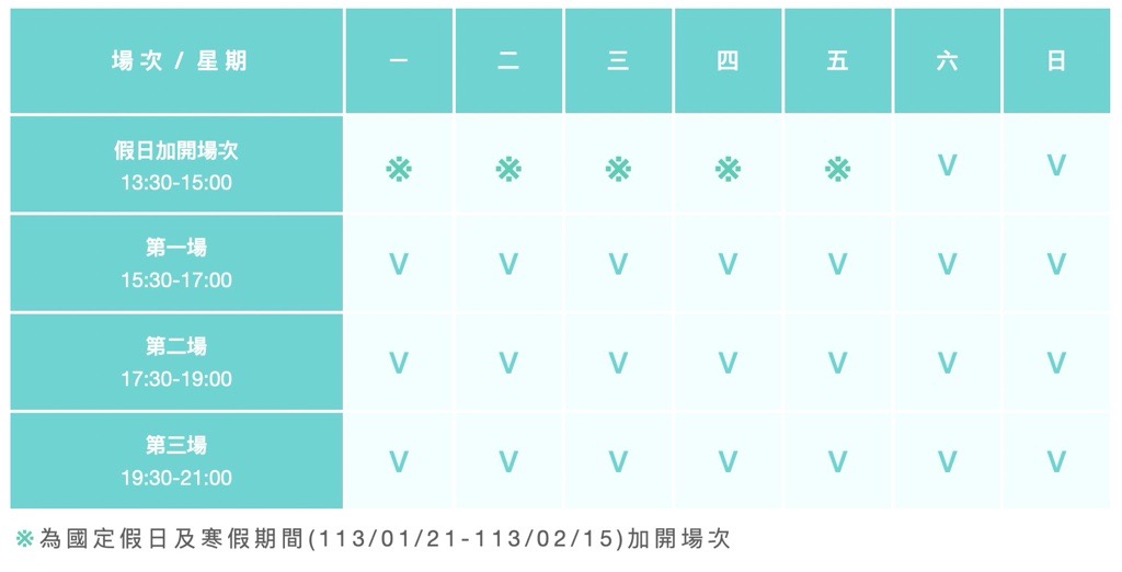 ✅周六至周日、國定假日 及 寒假假期間:170人