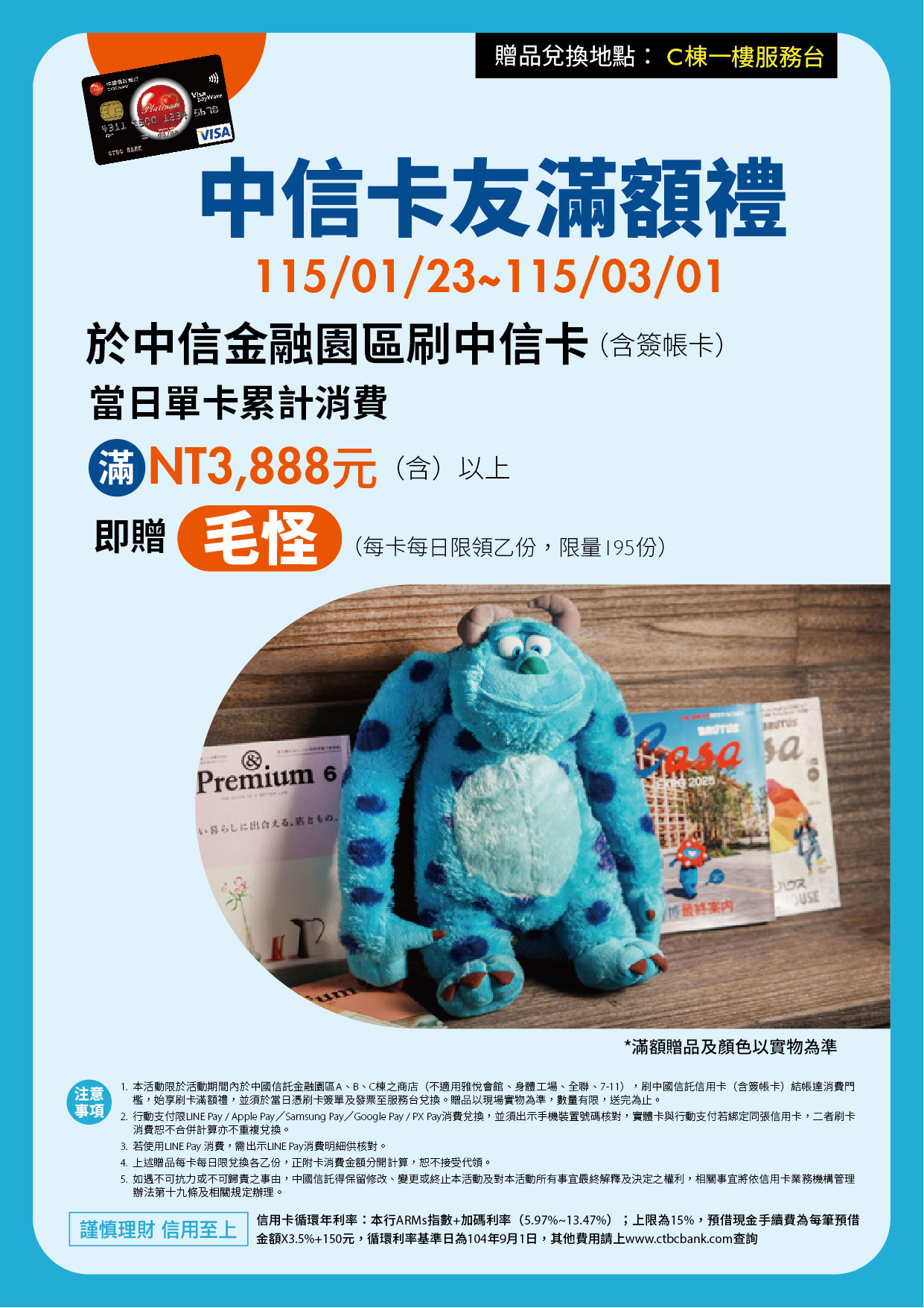 園區公告 2026.1.23-3.1 中信卡友滿額禮 更新時間:2026/01/08 回列表 其他消息Other News 園區公告 12.11-2026.2.22 暖冬盛宴友您真好-中信卡友限定回饋禮 園區公告 2026.1.23-3.1 園區滿額禮 園區公告 失物招領公告🔍│請洽C棟1F 服務台 02-2653-1079 園區公告 進場挺兄弟⚾ | 南港中信象迷大本營 消費滿額贈好禮 園區公告 金蛇喜迎春🐍 園區公告 南港中信 X 忍者亂太郎 | 忍蛋修煉術
